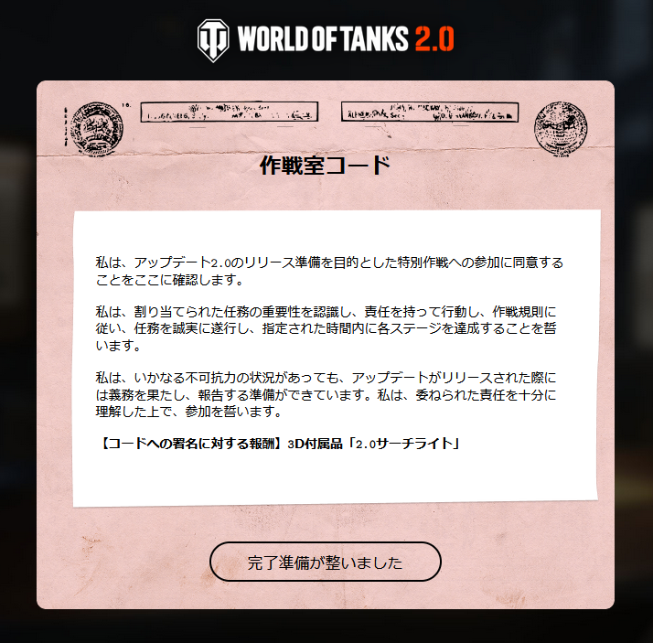 アップデート中暇なのでアカウント登録しているメールアドレスにWoT2.0作戦室のURLがあった為それをブラウザで開くと作戦室コードへの署名という物をするようにとのことで署名。