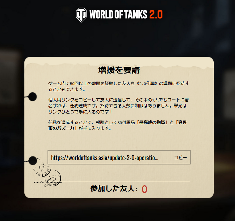 今までの経験上新人さんだと友人を招待が全然受け入れられないことを承知してい運営の中の人。その対応として50回以上戦闘した人も友人として招待できることになっています。生成されるリンクをSNS等あっちゃこっちゃに貼りまくって1人でも来てくれれば報酬が貰えるようです。