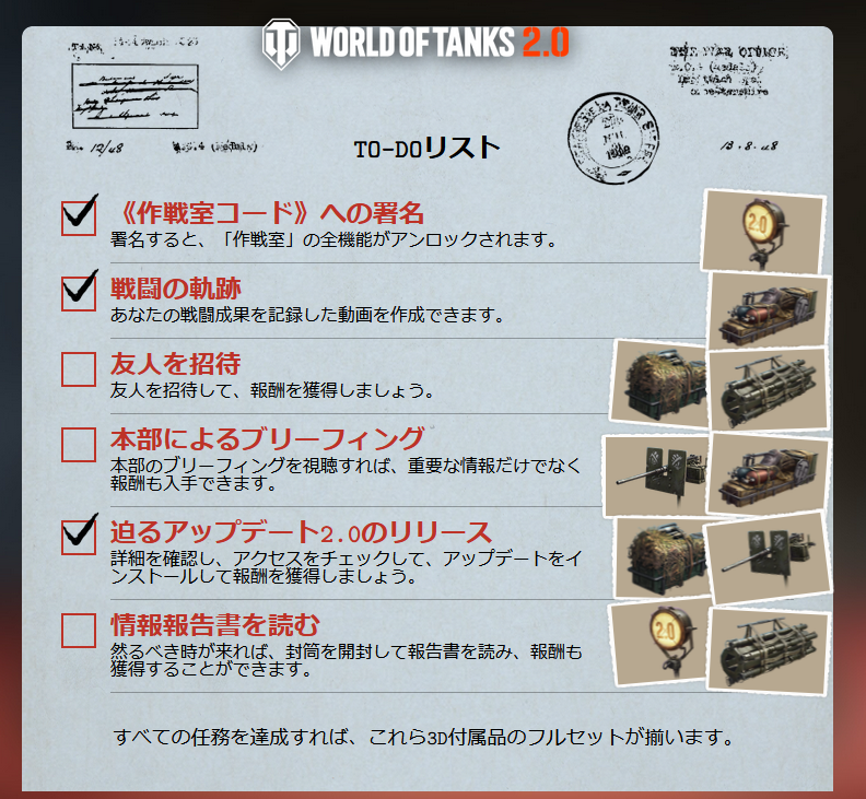 アップデートに伴って各種報酬が配られます。多分、皆同じ内容だと思います。条件を達成すると3D付属品のフルセットが貰えるようです。基本的に楽な内容だと思いますが一点問題なのが「友人を招待」かと思います。